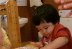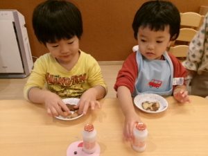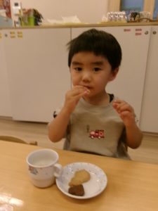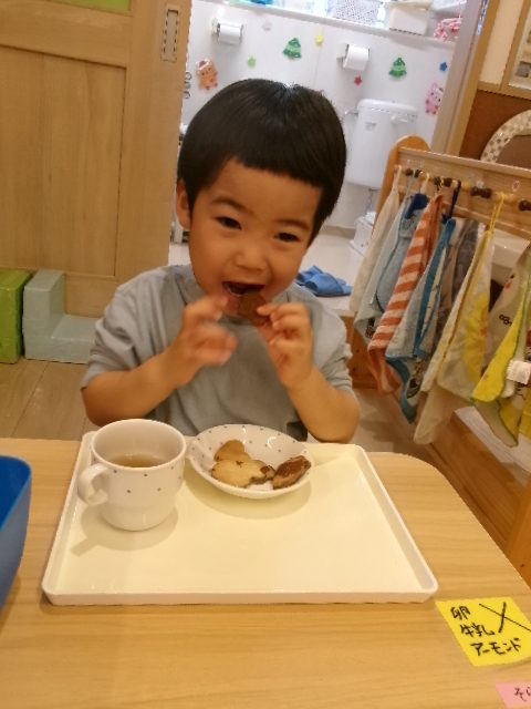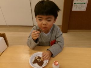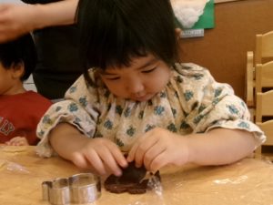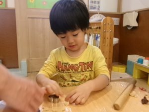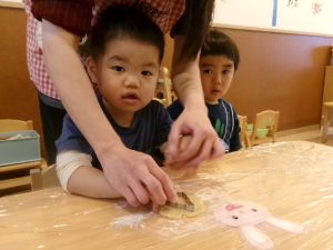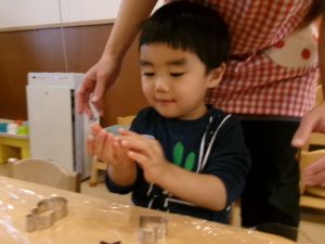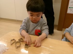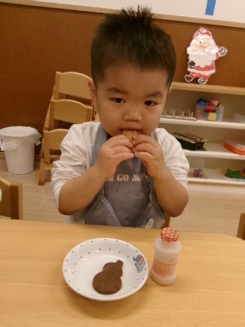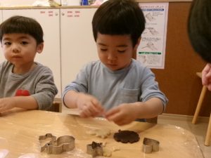 クリスマス会が終わったあと、3時のおやつに食べるクッキーの型抜きに挑戦しました。粘土あそびと違って少し苦戦する姿もありましたが、給食の先生や保育士に手伝ってもらいながら完成することができました。焼きあがったクッキーを手に美味しそうにほお張る姿が微笑ましかったです。