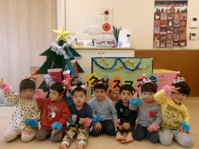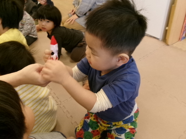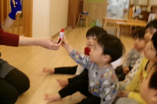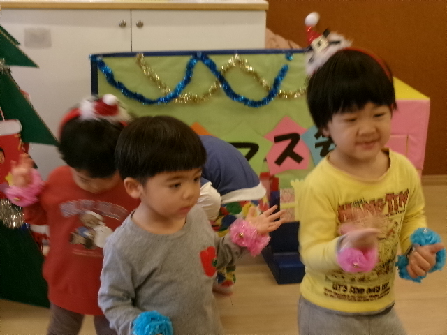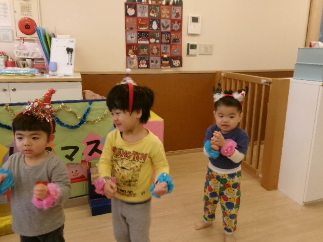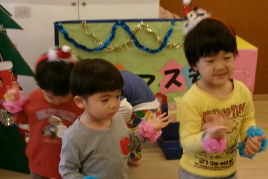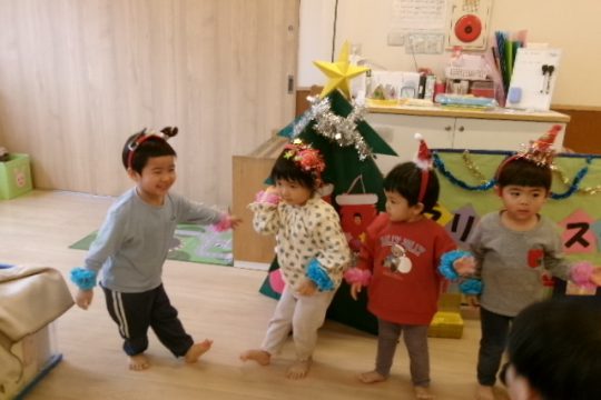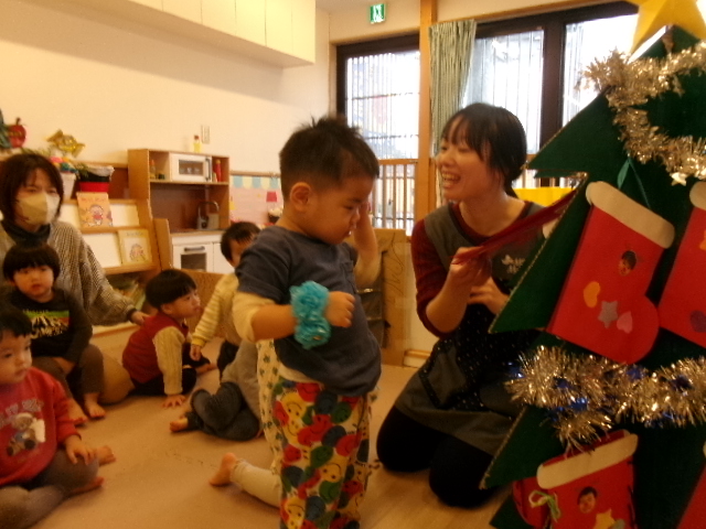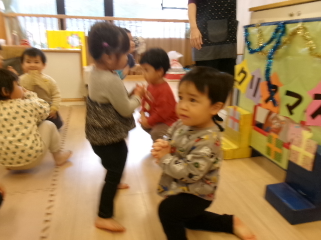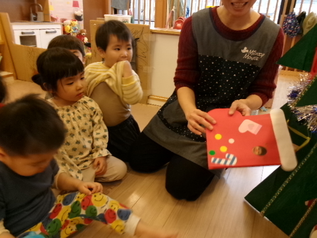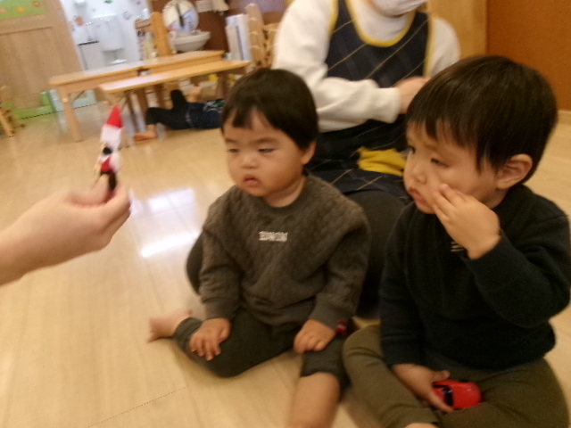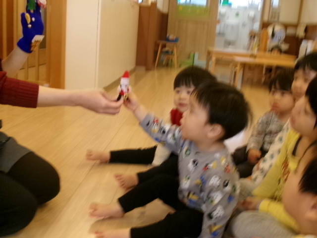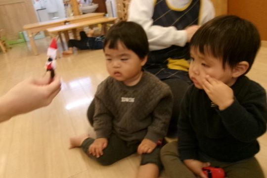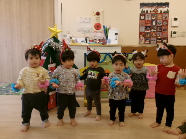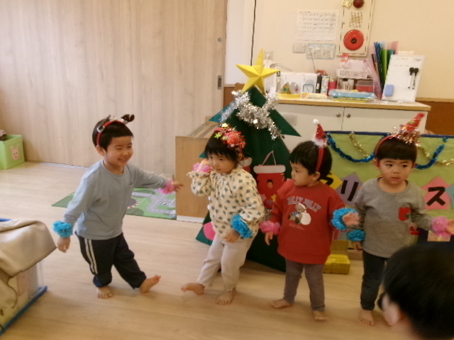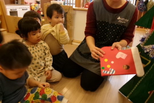 クリスマス会をしました。🎵あわてんぼうのサンタクロースの歌に合わせて、サンタの指人形が登場し、子ども達は興味津々。クラスからの出し物では、りす組さんは🎵きらきら星の歌、うさぎ組さんは🎵クリスマスのうたがきこえてくるよの曲に合わせて踊りを披露してくれました。最後は、みんながよく知っている🎵うさぎ野原のクリスマスの踊りをしてたのしいひと時を過ごしました。子ども達が作ったクリスマスブーツの中にサンタさんからのプレゼントが届くかな?