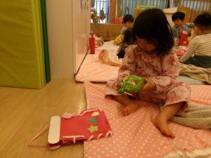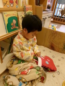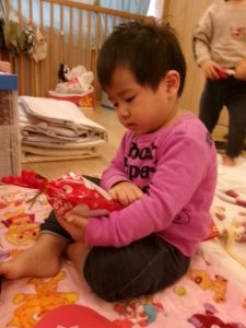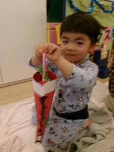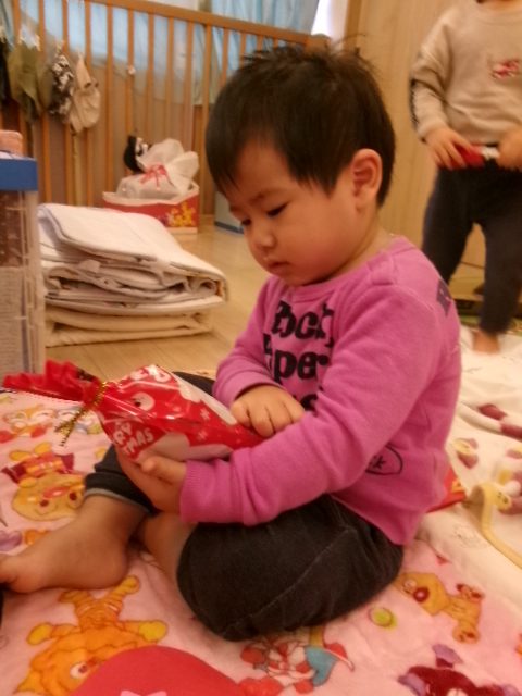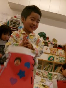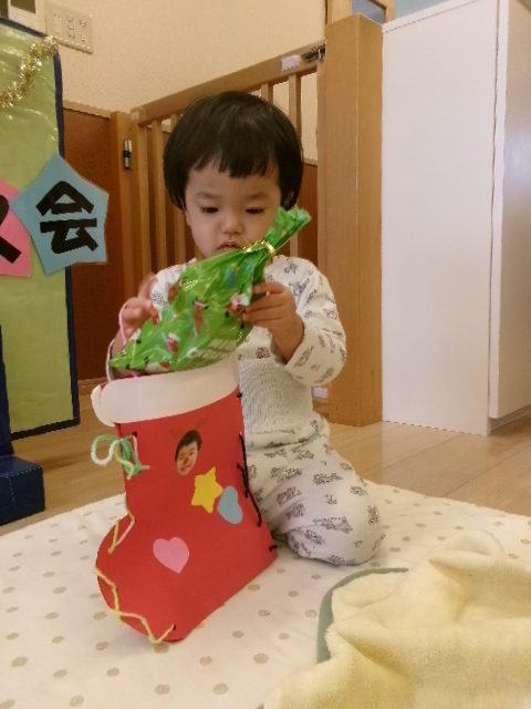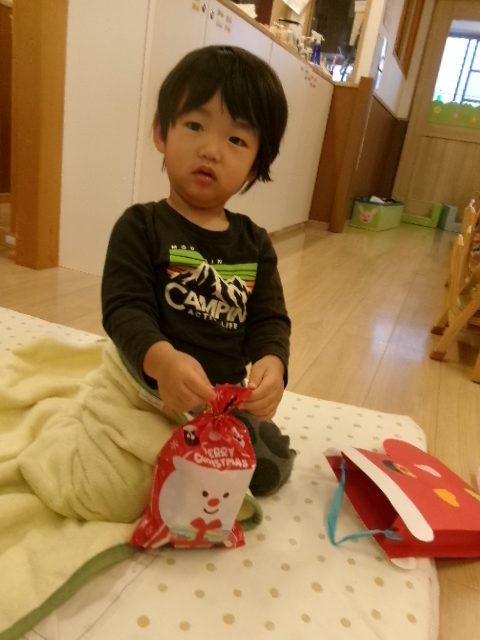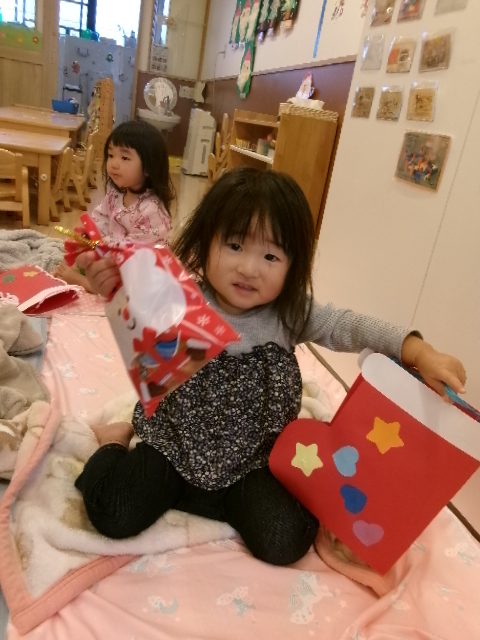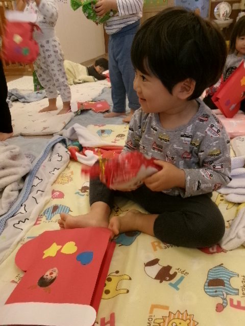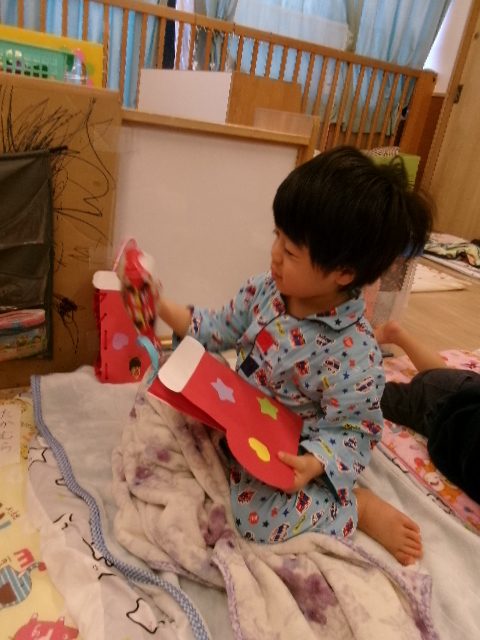 お昼寝から目覚めると・・・今年もサンタさんがやってきてくれました。子どもたちの枕元に膨らんだブーツをみんなこっそりのぞいて見ていましたよ!