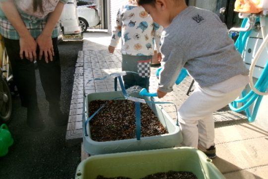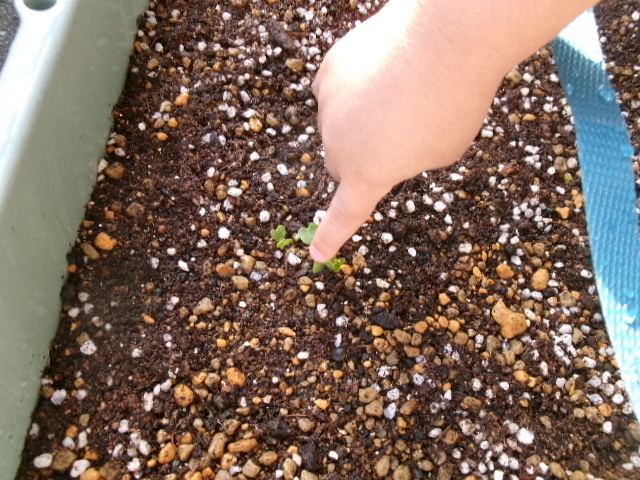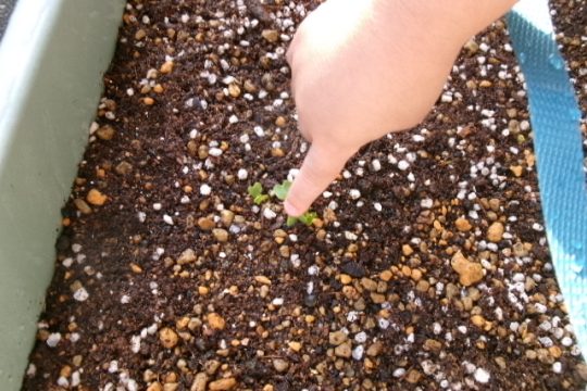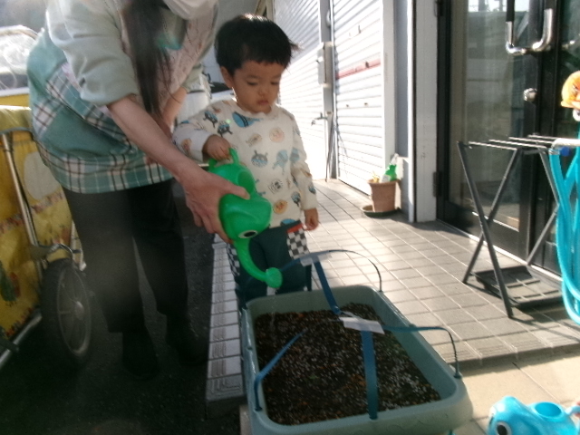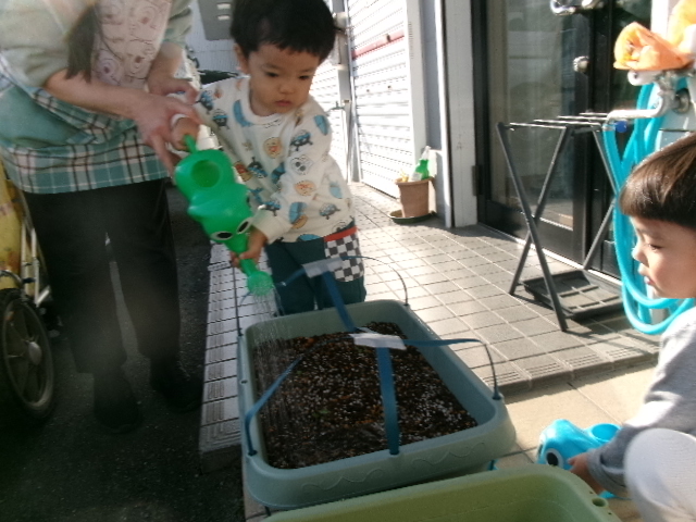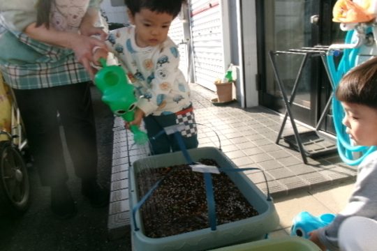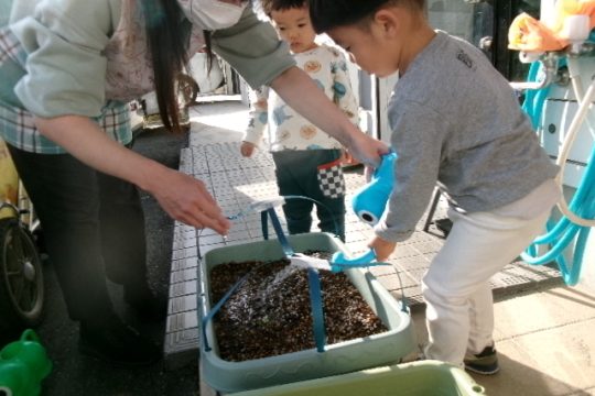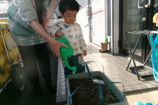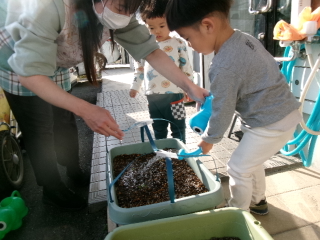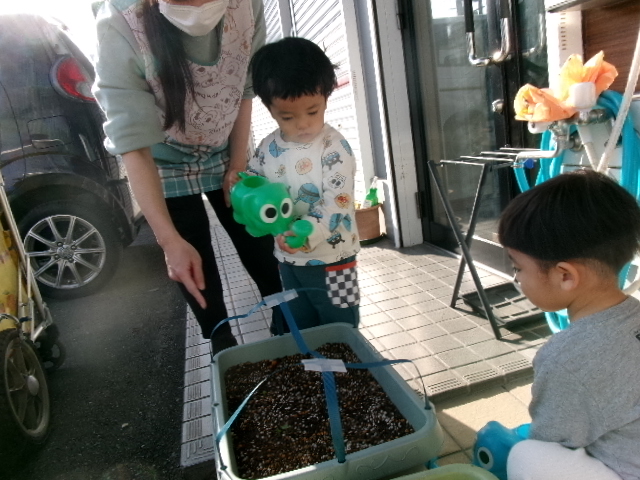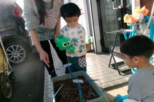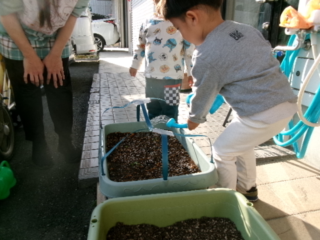 大根の種まきから1週間たってもなかなか芽が出る気配がなく、「もうダメかな?」と心の中で諦めかけていた保育士たちでしたが・・・な、な、なんと、昨日、今日の暖かな天気が影響し、小さな芽を発見!早速、子ども達に知らせ、水やり当番が始まりました😊