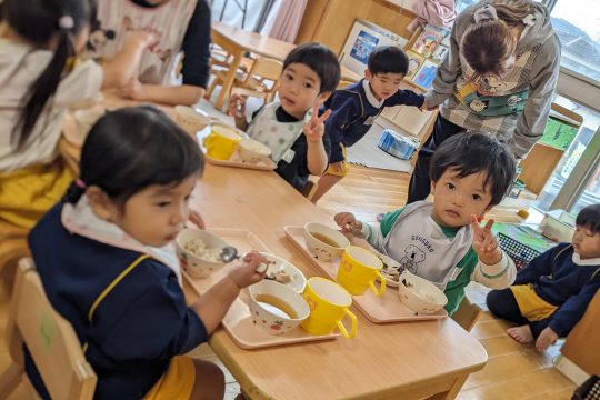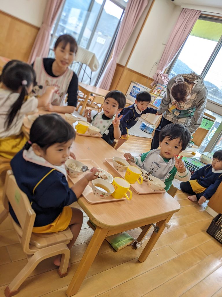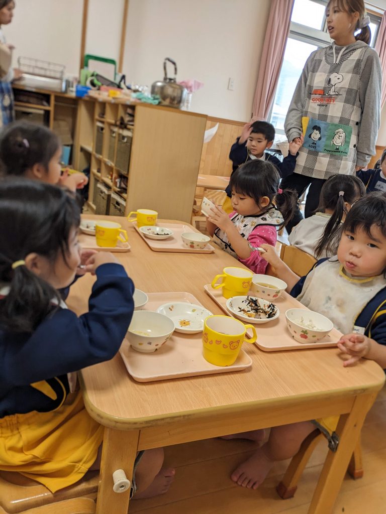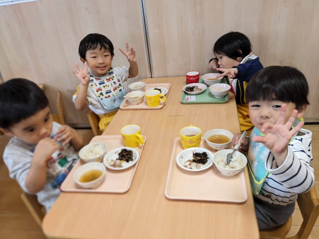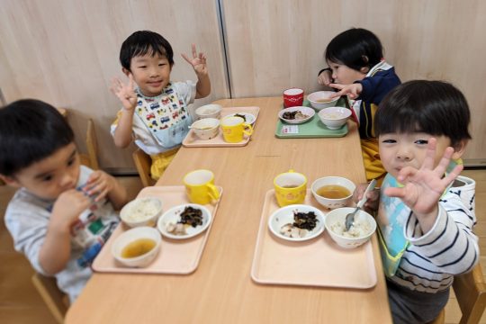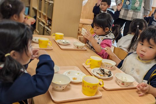 給食の時間には、なかがわ保育園のお友達と一緒のテーブルで食事をしました。初めての場所でも、少しずつ打ち解けて笑顔が増えていく様子に、私たちも嬉しくなりました。